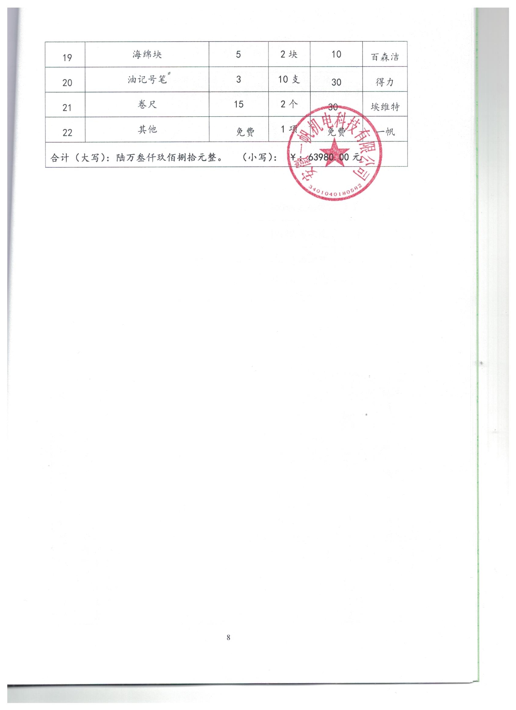 阜阳市颍泉区中市信泰机电经营部,报价明细表未盖章,资格审查不通过。