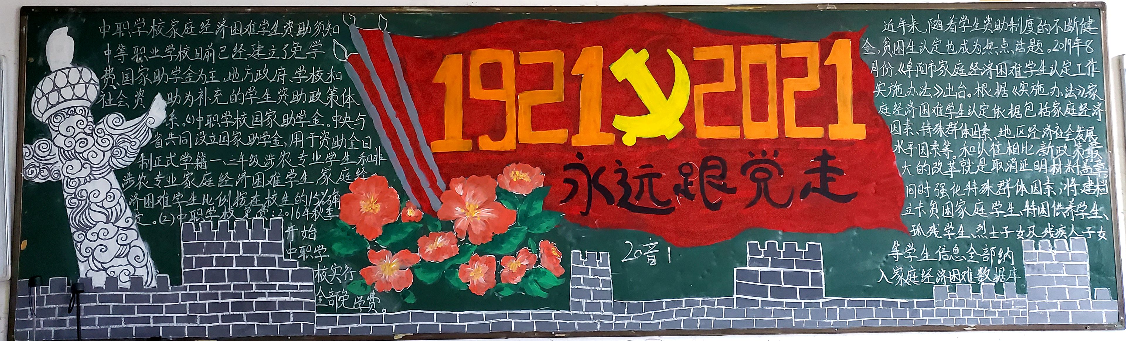 阜阳工业经济学校积极深入开展党史学习教育活动,掀起了党史学习教育的热潮。校团委与资助办于4月22日开展以“学党史、知党情、跟党走”为主题的黑板报举办活动,各年级积极筹划,各班黑板报办得有声有色,得到广大师生的好评。