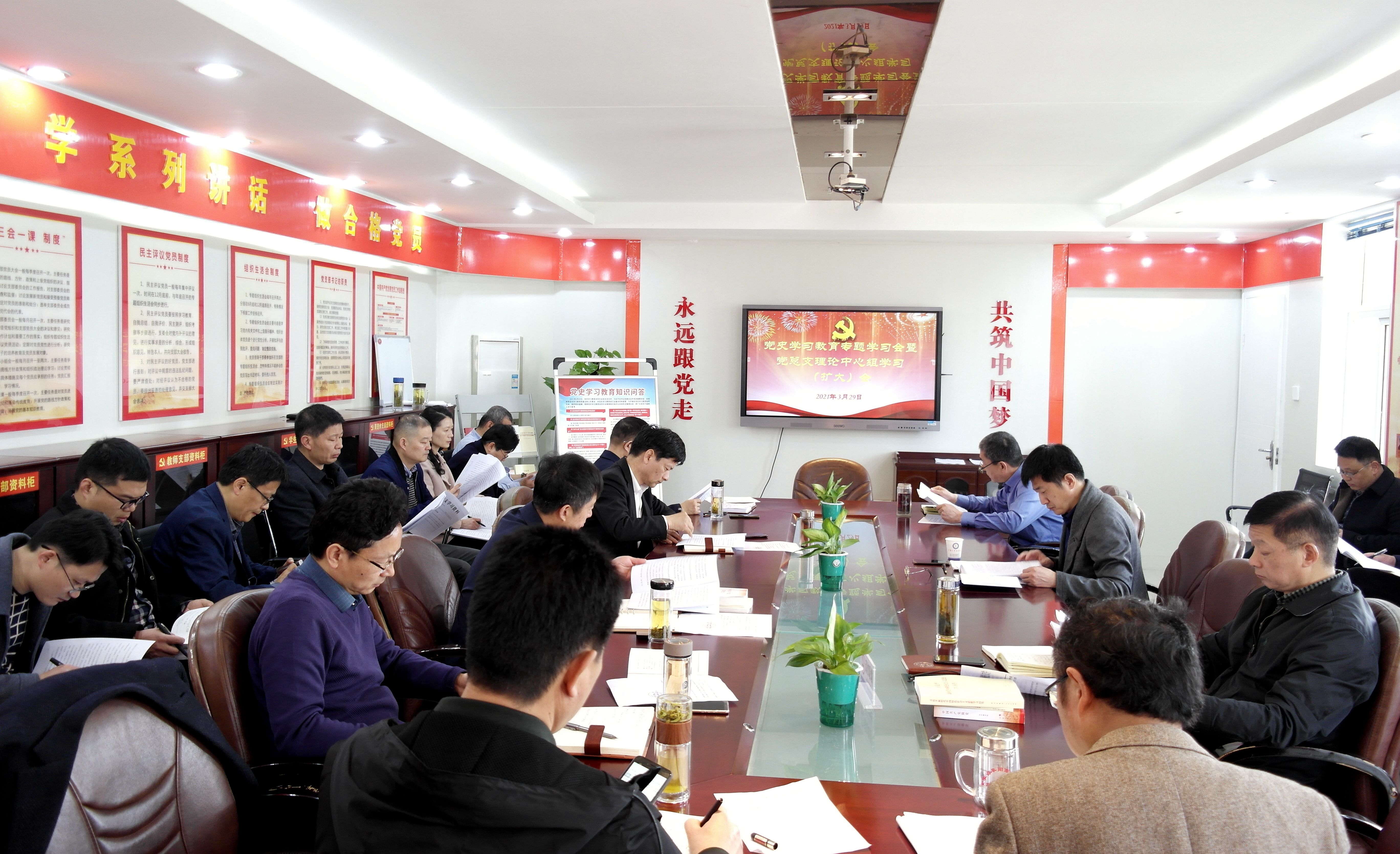 3月29日上午,阜阳工业经济学校召开党史学习教育专题学习会暨党总支理论学习中心组学习(扩大)会。校班子成员、各科室负责人参加会议。会议由副校长潘光辉主持。