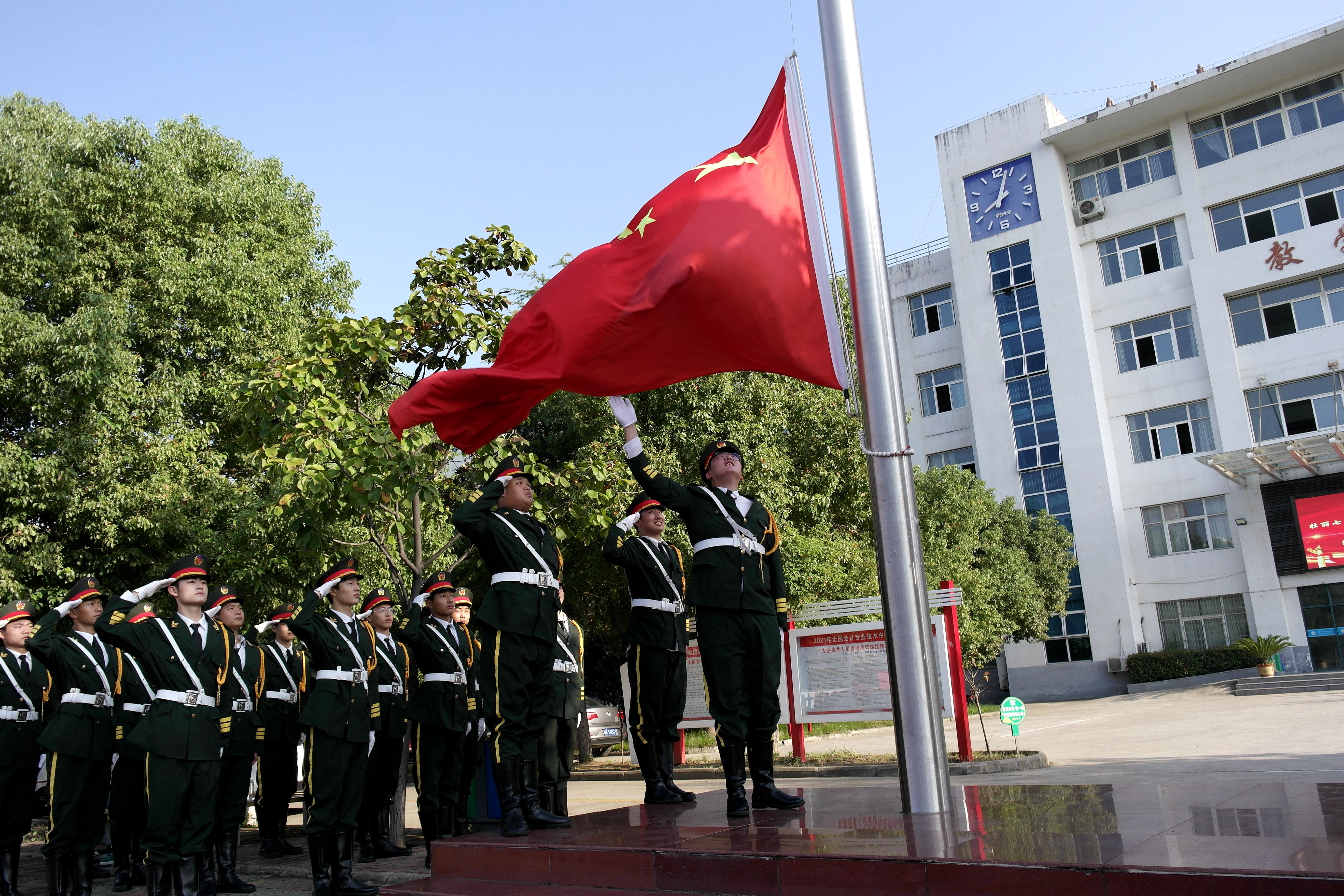 随后全体师生怀着对祖国的热爱,饱含深情同唱国歌,注视国旗冉冉升起。校微宣讲团成员丁清霜作了国旗下的“礼赞新中国 奋进新时代”主体宣讲,并联系学习党史和学习经历,激发同学们要以实现中华民族伟大复兴为已任,增强做中国人的志气、骨气、底气,不辜负党和人民的殷切希望。