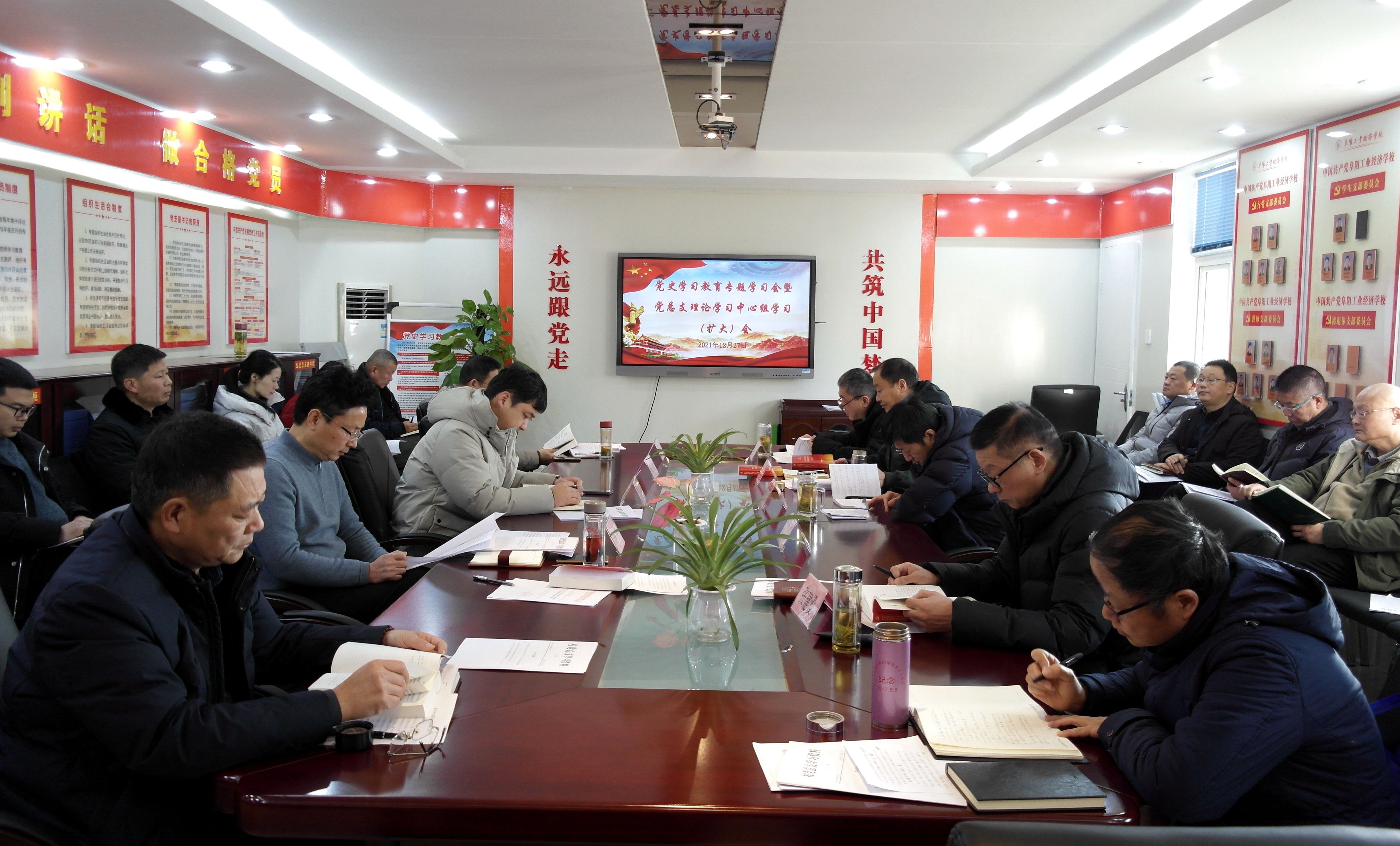 12月27日,阜阳工业经济学校召开党史学习教育专题学习会暨党总支理论学习中心组学习(扩大)会。校班子成员、各科室负责人参加会议。会议由副校长潘光辉主持。