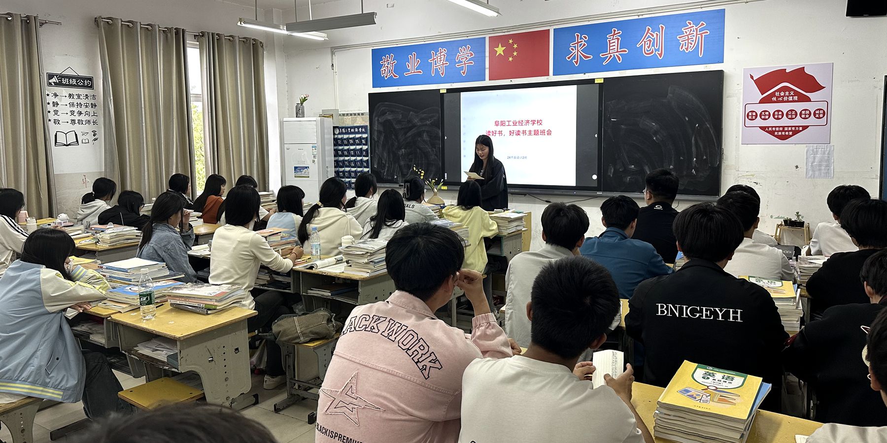班会上,老师们指出,书籍是人类智慧的结晶,是获取知识、开阔视野的宝贵资源,要让阅读成为青春奋发的生活常态。每日坚持阅读,每天至少读书一小时,每月精读一本好书,与书为友,从传统文化中汲取养分,从红色书籍中感悟初心使命,以阅读塑造品格,以知识赋能发展;知识结构更新的重要方法就是读书,就是学习,“活到老,学到老”。