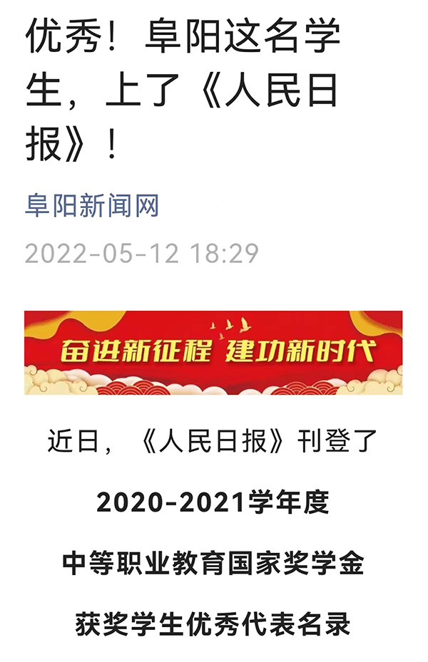 张旭同学2022年5月荣获2020—2021学年度中职国家奖学金优秀学生代表线上(阜阳新闻网)宣传。
