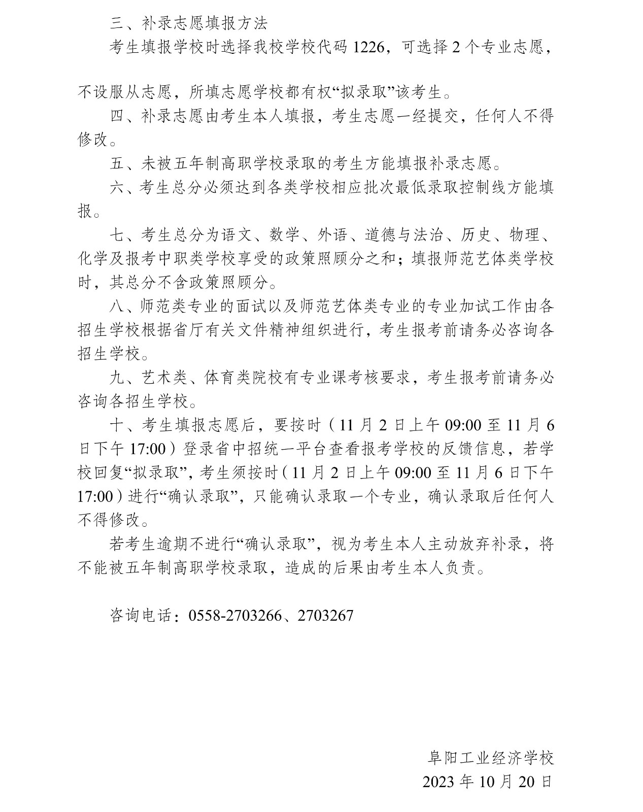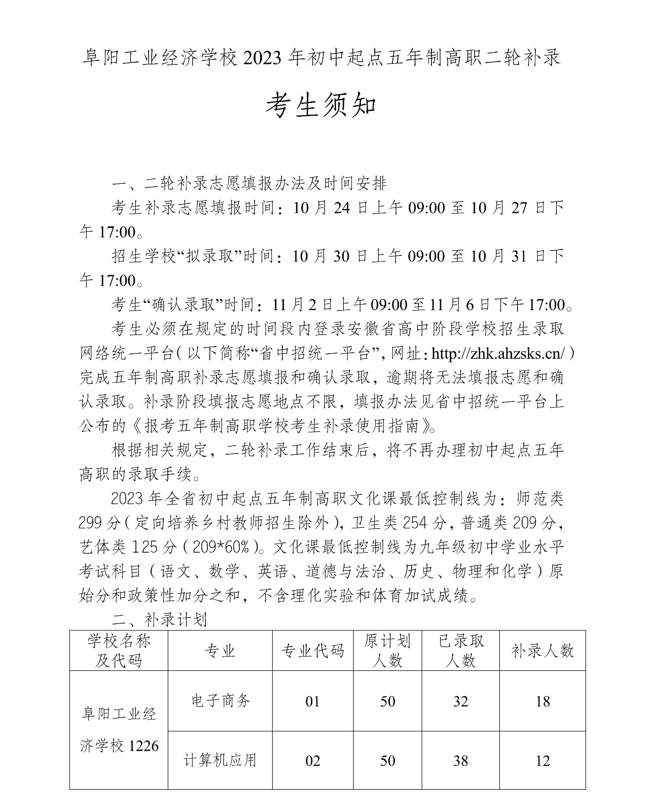 2023年初中起点五年制高职二轮补录—考生须知