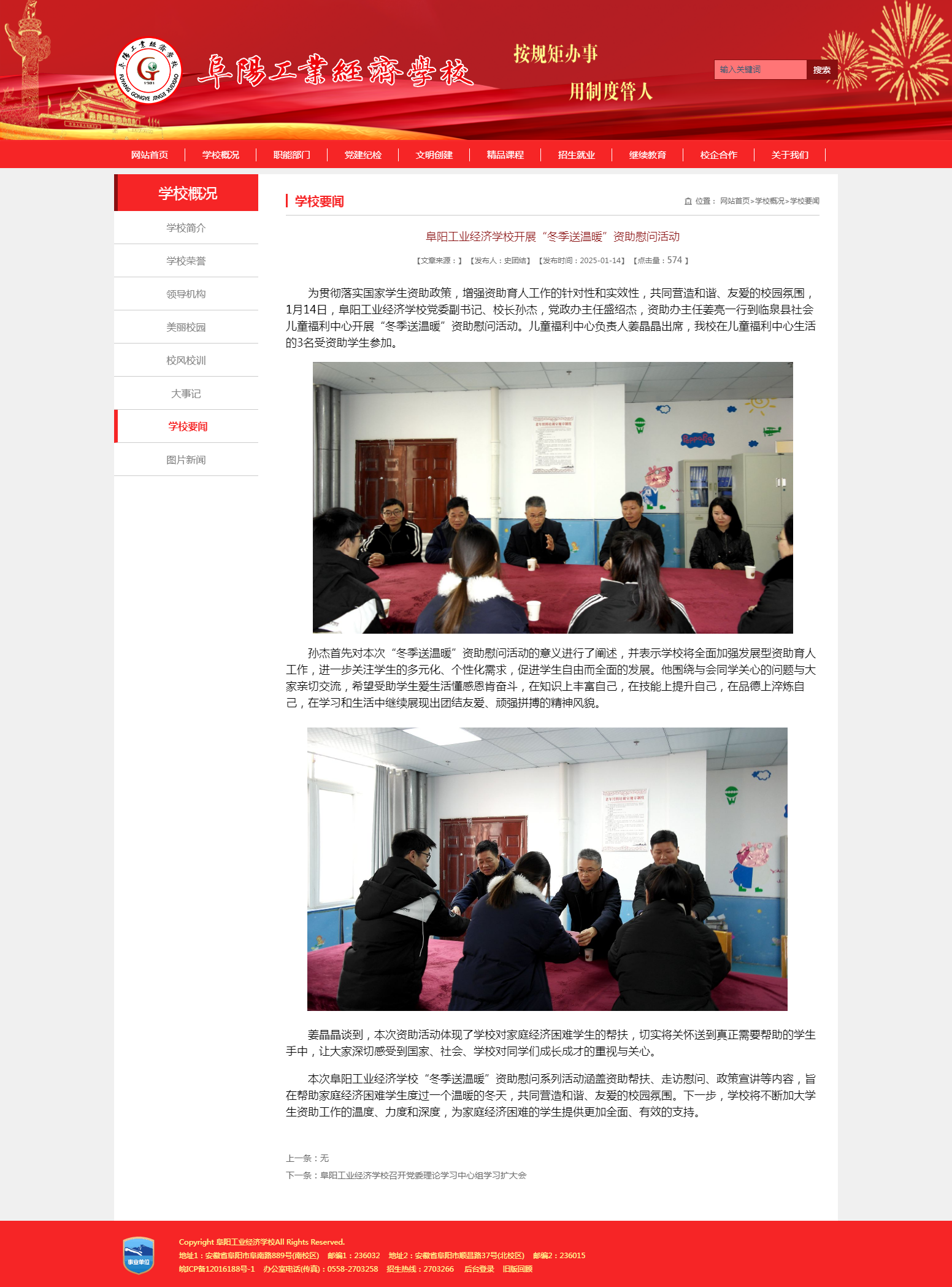 阜阳工业经济学校学校网站报道“阜阳工业经济学校开展‘冬季送温暖’资助慰问活动‘’