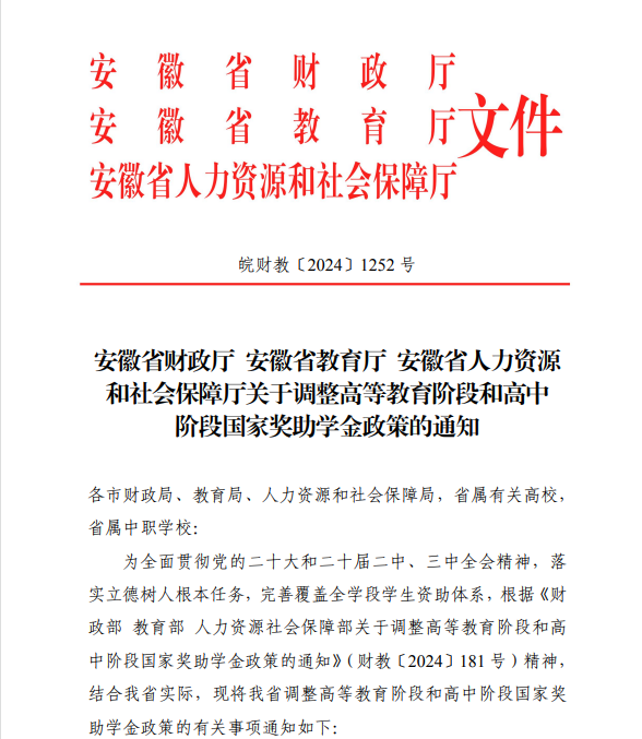 转发《安徽省财政厅 安徽省教育厅 安徽省人力资源和社会保障厅关于调整高等教育阶段和高中阶段国家奖助学金政策的通知》》