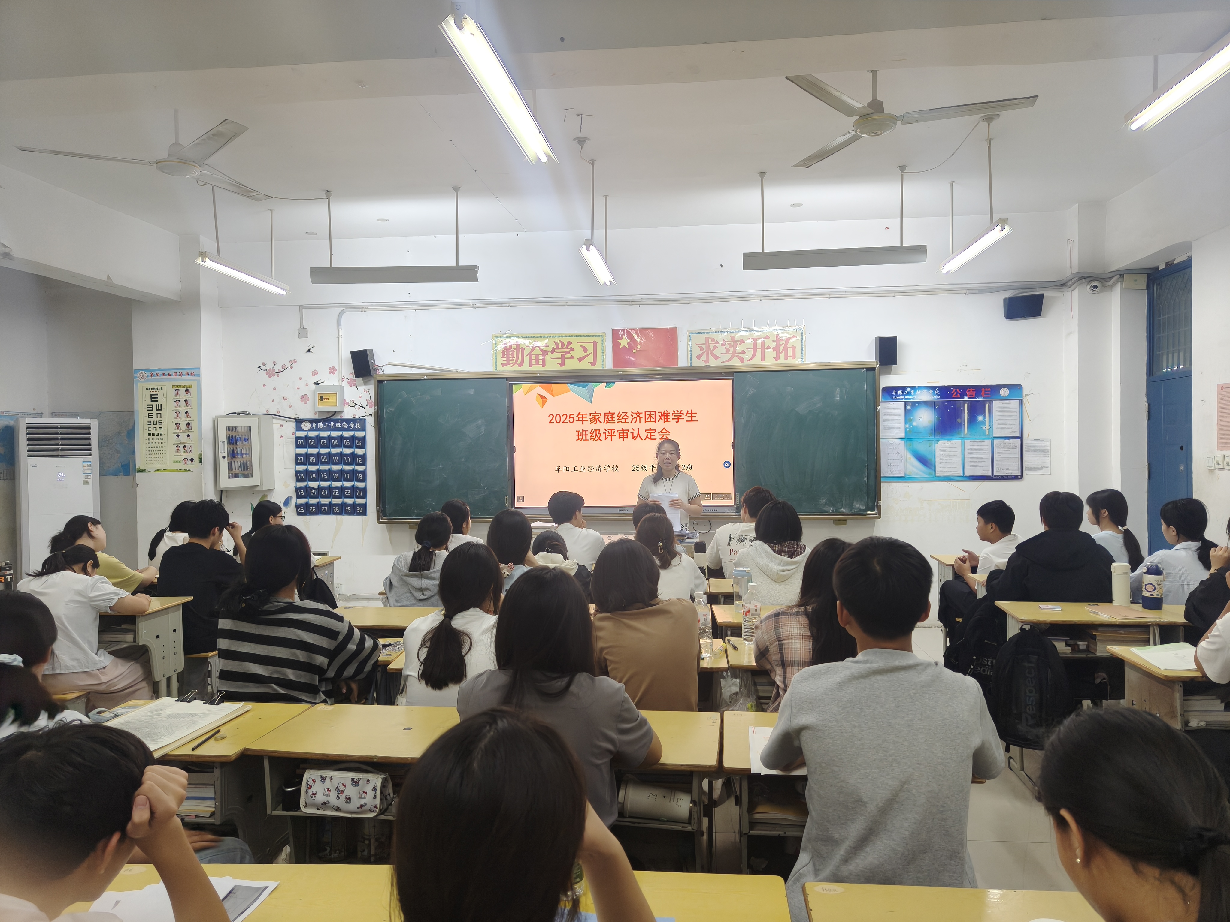 阜阳工业经济学校2025年秋季学期根据皖财教[2024]1252号文件、阜财教[2025]42号文件通知要求正式启动家庭经济困难学生班级评审认定工作。各班级按照校资助办公室工作要求利用晚自习时间召开国家助学金家庭经济困难学生评审认定会,班主任系统地讲解了国家助学金的认定办法、申请条件、标准、评审、申报流程及相关表格填写注意事项。